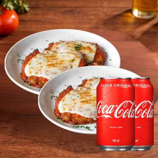 2 quentinhas G (750ml) de Parmegiana + 2 coca cola lata